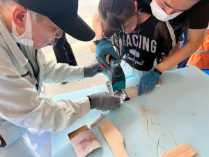 ボランティアの私たちは、木材の固定、ジグソーの使用補助、色塗りの手伝いなど、安全面にも十分配慮しながらサポートを行いました。